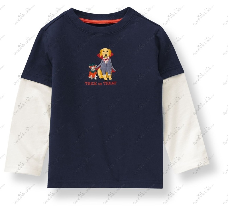 Felt appliqué double sleeve tee features a pair of dogs dressed up like a pumpkin and Count Dracula.
