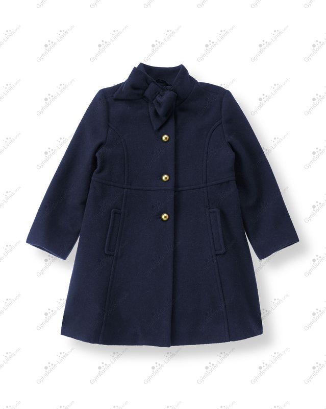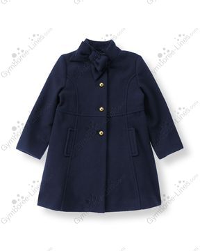 Sweet and cozy, our blended wool felt layer features a gold-tipped button front design finished with a bow accent and princess seams.