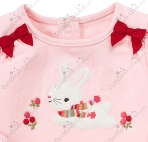 Simply sweet for your darling snow bunny. Our soft long sleeve bodysuit is prettied up with embroidery and velour appliqués. Finished with puffed shoulders and grosgrain ribbon bows.