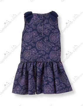 Jacquard party dress is decorated with shimmer blooms. Dropwaist design features shoulder bow accents.