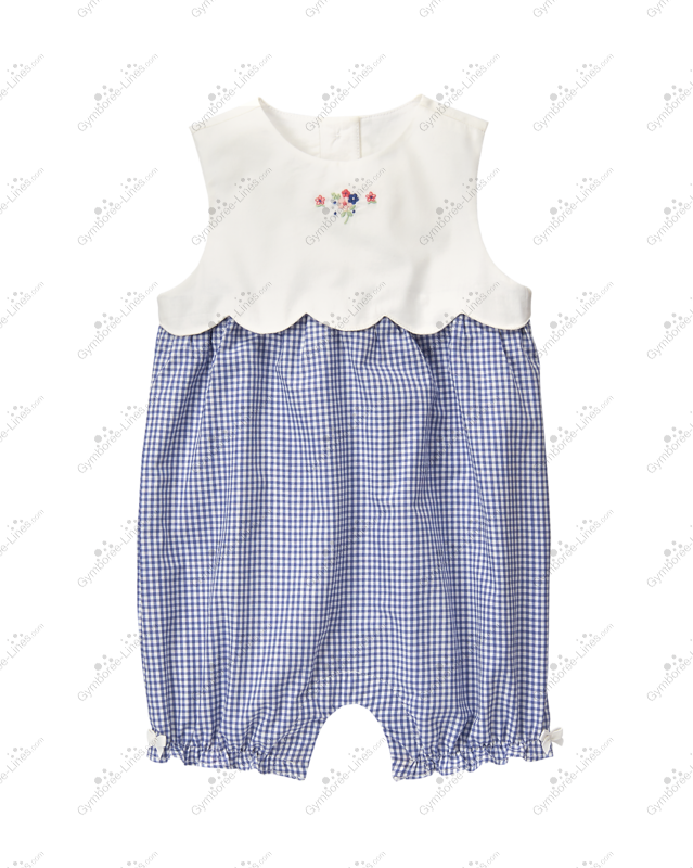 Embroidered blooms and pretty gingham print create a precious look for her. Finished with scalloped trim and little bows.