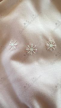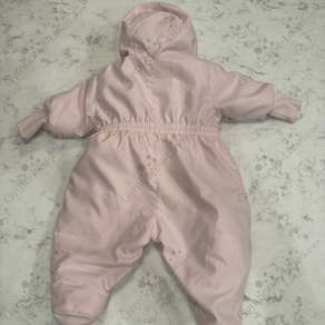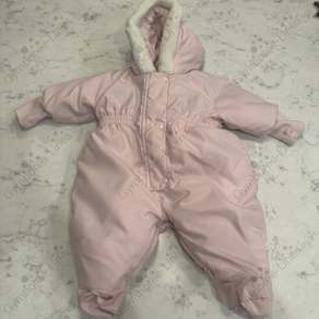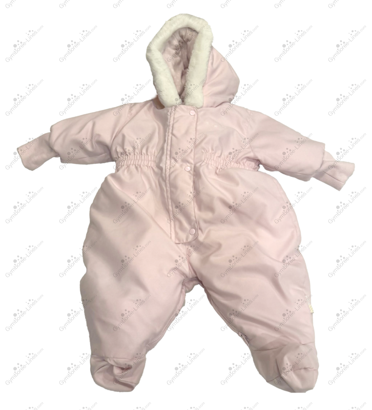 Pastel pink hooded bunting snowsuit. Polkadot print hood lining. Three snowflakes embroidered on the left chest. Grow cuff sleeves. footed legs.