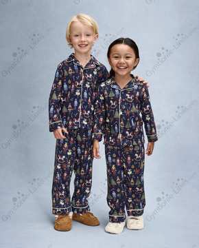 Gymboree TCP Navy Blue Nutcrackers Holiday Theme Allover Print Flannel Gymmies Pajamas Button Front Pull On Bottoms Contrast Piped Trim Ballet Mice Mouse Rocking Horses Poinsettias Christmas Trees Holly Fir Sprigs Ornaments Candy Canes Two Piece Set Tidal Blue