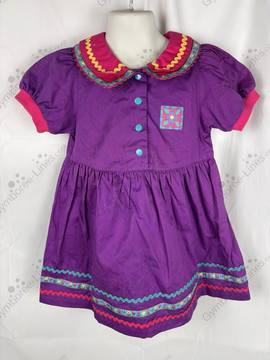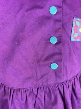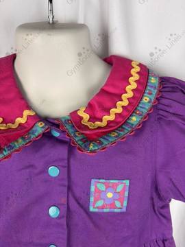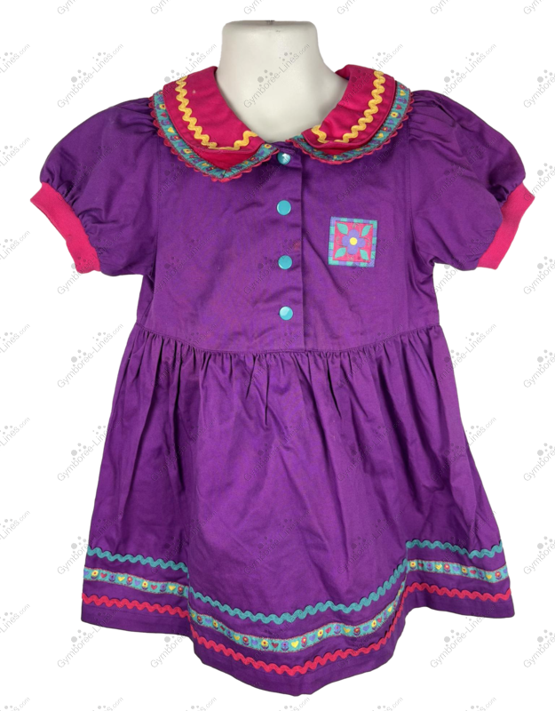 Purple dress with a double collar featuring rickrack and flower/heart ribbon trim on the collar and hem. A square patch with a flower on the left chest. Blue enamel snaps up the front.