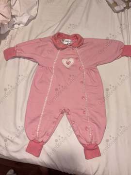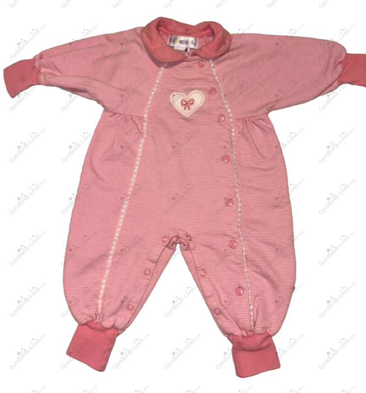 Long sleeve pink striped romper with an applique heart with a bow on the chest. Peter Pan collar. Asymetrical front snaps. Lace trim down the front.