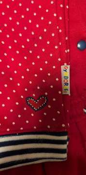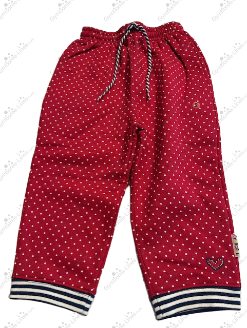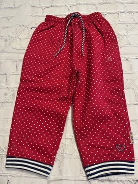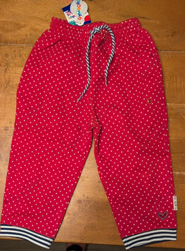 Red polka dot pants with blue & white drawstring waist. heart embroidered on left leg. blue & white striped cuffs.