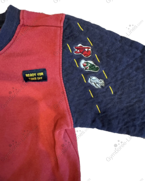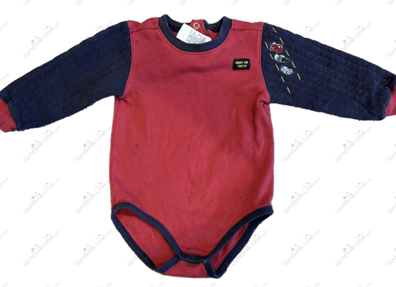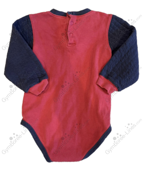 Red bodysuit with navy quilted long sleeves and contrast trim. 'Ready For Take Off' patch on left chest. Three planes embroidered on top of the left sleeve.