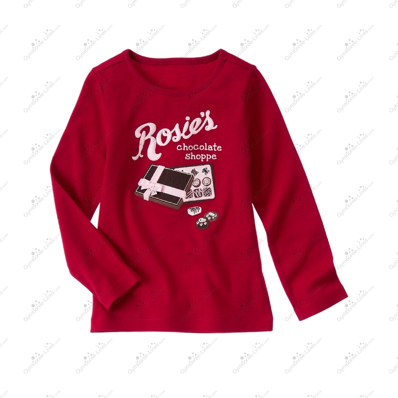 Delicious style sure to delight her sweet tooth! Our cute Rosie's Chocolate Shoppe tee is fancied up with embroidered lettering, glittery gems and sweet poplin appliqué bonbons in a box topped with a grosgrain bow. WARNING: CHOKING HAZARD - Small parts. Not for children under 3 yrs.
