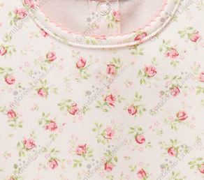 Pure sweetness is perfectly captured in our soft ribbed cotton rose floral print bodysuit. Picot trim on collar and elasticized ruffle cuffs offer dainty detail. Snaps in back and underneath assist with dressing. Fits sizes preemie to 12-18 months.