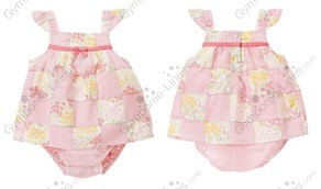 Dainty and sweet, our airy skirted bubble features an authentic patchwork design of delicate blossom florals and crisp seersucker stripes. Satin bow trim and flutter sleeves provide darling finishing detail. Full batiste lining with attached seersucker bloomer completes the look. Buttons in back and snaps underneath assist with dressing.