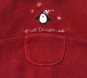 Soft and plush, our First Christmas velour one-piece features embroidered snowflakes and velour appliqué penguin to create a festive wintry scene. Peter-pan collar, gingham piping and front pocket finish the warm look. Snaps in back and underneath assist with dressing. Fits sizes preemie to 12-18 months.