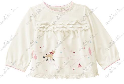 Adorable felt appliqué ice skating baby giraffe and embroidered snowflakes decorate our soft cotton jersey ruffle top. Contrast picot trim finishes the delicate look. Snaps in back assist with dressing.