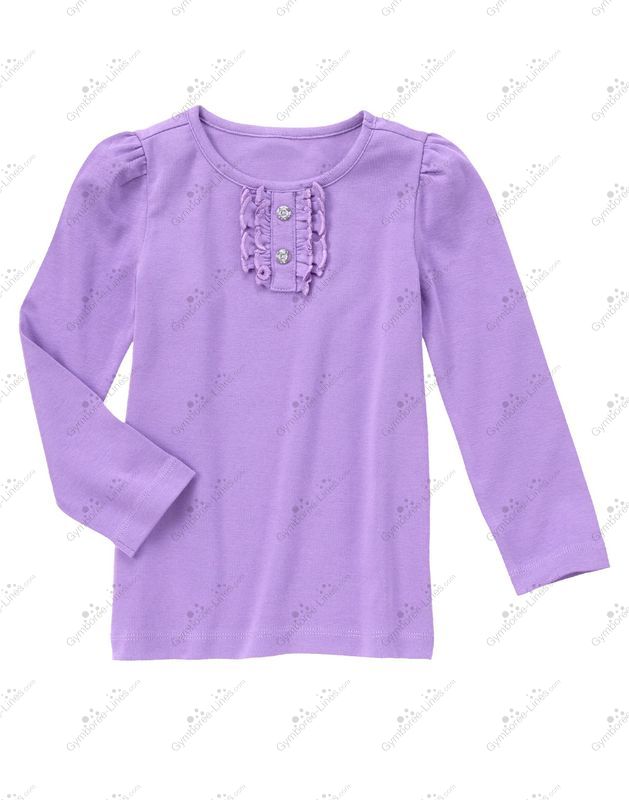 Soft and comfy tee is fancied up with pretty ruffles and sparkly gem buttons.