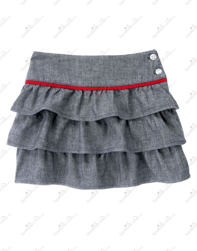 Gem buttons and bright ribbon on a twirly chambray skirt.