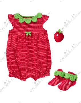 Give your new baby girl pure sweetness. Adorable dot one-piece evokes a yummy strawberry. Comfy booties and a plush rattle toy complete the darling look.