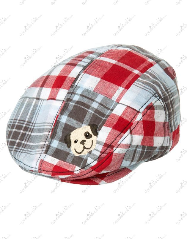 Preppy plaid cap featuring faux patchwork and an embroidered pup.