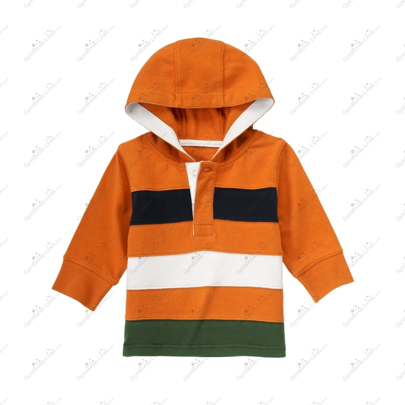 Our rough and tumble rugby features authentic pieced stripes and a twill placket, plus a hood for extra style and warmth!