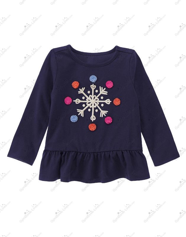 Gymboree Gym Navy Blue Peplum Ruffle Tee Top Long Sleeves Embroidered Embroidery Ivory Snowflake Orange Sky Blue Polar Pink Pom Poms