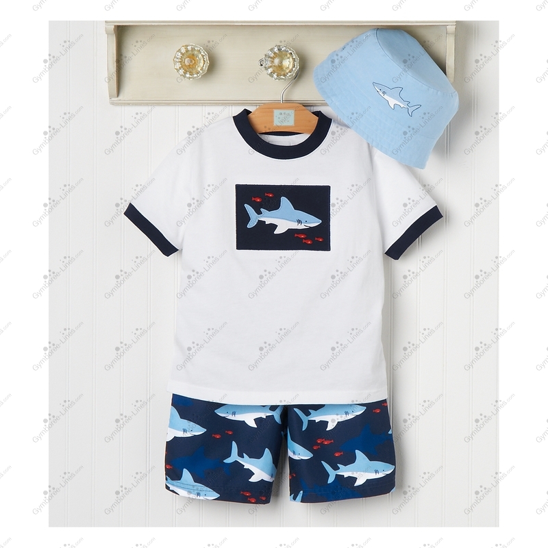 For ocean-inspired style, our soft cotton jersey ringer tee features a smiling shark in poplin appliqués and colorful embroidered fish on a jersey appliqué. Inner neck lined with coordinating twill tape finishes the casual warm weather look.