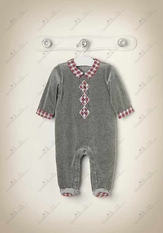 Argyle plaid poplin appliqués decorate our footed one-piece for a sweet feel. Plaid poplin collar, cuffs and piping finish the rich look. Crafted in soft cotton blend velour for exceptional comfort and warmth. Snaps in back and underneath assist with dressing. Fits sizes preemie to 6-9 months.