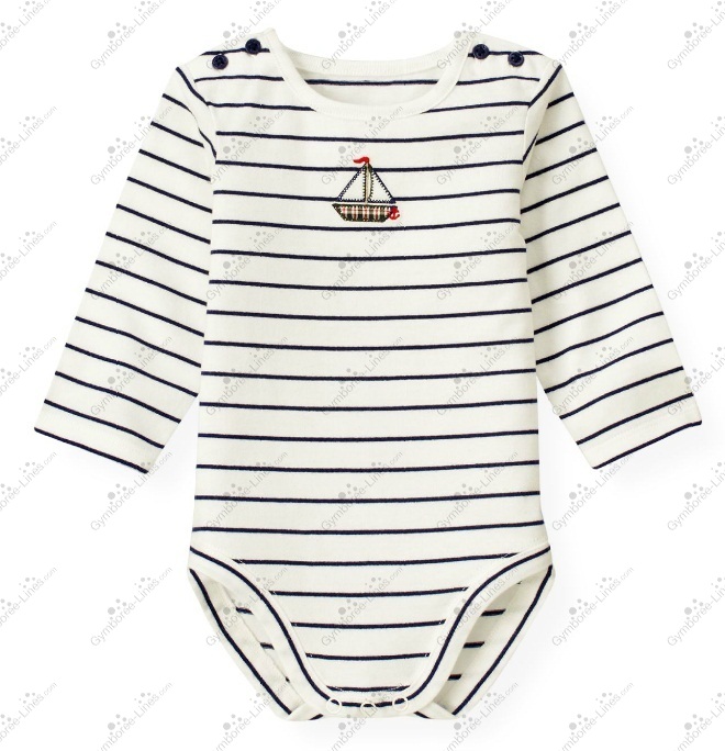 Nautical sweetness is perfectly captured in our soft cotton jersey stripe bodysuit with an appliqué sailboat on the chest. Buttons at the shoulders and snaps underneath assist with dressing. Fits sizes preemie to 12-18 months.