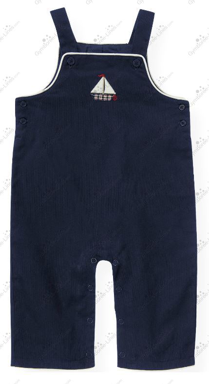 An appliqué sailboat and piping details our soft cotton Bedford corduroy overall. Back pockets offer classic style. Fully lined in fine cotton batiste for exceptional comfort. Adjustable button strap design and snaps underneath assist with dressing.